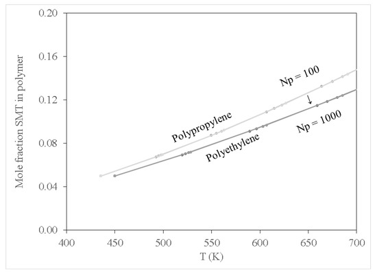 Effect of temperature on SMT content of PP and PE with respect to the degree of polymerisation (Np).