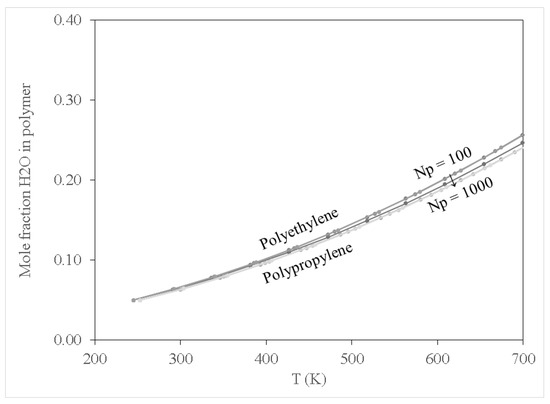 Effect of temperature on water (H2O) content of PP and PE with respect to the degree of polymerisation (Np).