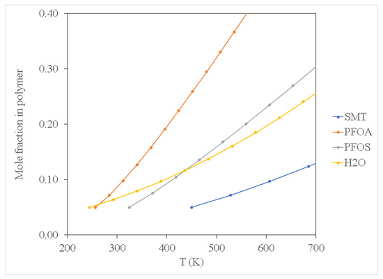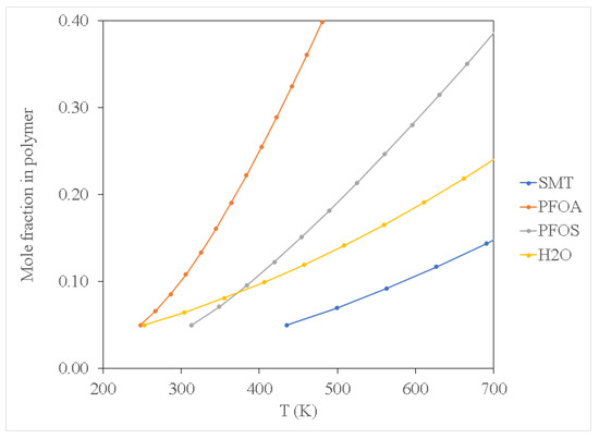 An extended Flory–Huggins approach was used to model sorption of SMT, PFOA and PFOS on PE and PP. Previous work [29,30,31] using Gibbs ensemble Monte Carlo simulations modelled sorption in polymers by considering phase equilibria between polymers and fluid systems, analogous to the current work undertaken along different methodological lines. For the sake of reference within the context of aqueous environments, sorption of water in both polymers was also considered. Both temperature and the degree of polymerisation were considered, and it was found that on a molar basis the latter did not play a significant role in the uptake of SMT, PFOA, PFOS or water, whereas temperature effects were significant. While not explicitly accounted for in this work, the results were evocative of a pore-filling mechanism.