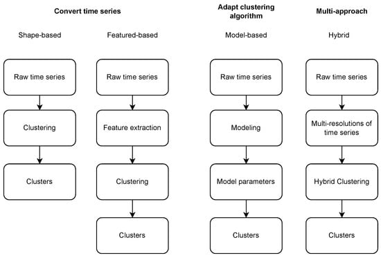 In the literature, the classic and most popular time series clustering category is known as whole time series clustering, which, given a set of individual time series data, the objective is to group similar time series into the same cluster. In order to perform whole time series clustering, most of the approaches follow one of three major mechanisms: (1) Convert time series to static multivariate data using feature extraction and perform traditional clustering [25]; (2) Adapt traditional clustering algorithms to work with time series (e.g., distance-based approaches with elastic measures) [25]; and (3) Use a multi-step hybrid approach combining different methodologies [24]. Figure 1 summarizes the main mechanisms of time series clustering approaches.
