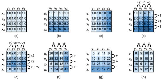 Illustrative forms e of subspace coherence: (a) constant values, (b) constant values on rows (pattern on columns), (c) constant values on columns (pattern on rows), (d) coherent values (additive model), (e) coherent values (multiplicative model), (f) overall coherent evolution (order-preserving model), (g) coherent evolution on the rows, (h) coherent evolution on the columns [12].