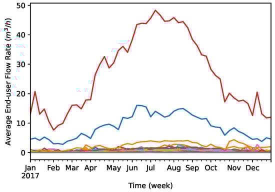 Sustainable management of water supplies generally depends on the continuous collection, monitoring, and analysis of sensor data (e.g., pressure, flow, consumption), which need to be translated into usable information for daily control and strategic planning. Over the last few years, with the arrival and deployment of smart grid meters within water distribution systems (WDSs), there has been an increasing collection of data that raises new opportunities and challenges for the entities responsible for managing these systems [1]. The data produced by smart meters, usually in the form of georeferenced time series data (measurements sequentially recorded through time), provide essential information that enables the application of data analytics’ tools to model end-use water consumption profiles. With this actionable information, water companies and municipalities have better knowledge of what to expect from customers and thus develop efficient marketing strategies [2], promote water-saving behavioral changes [3], enhance water infrastructure planning [4], and manage water demand and detect anomalies [5].