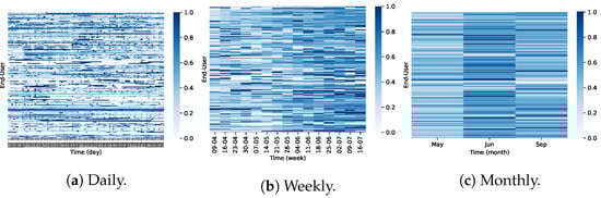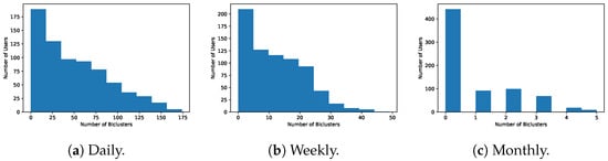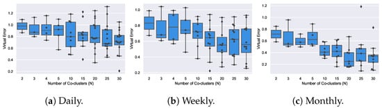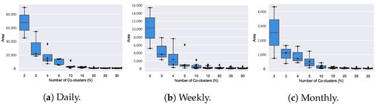 The amount of noise tolerated per pattern is also a property that affects the restrictiveness of the search and thus the biclustering structure. The desired number and shape of the discovered water consumption patterns depends on the subsequent task. When performing biclustering to support water consumption profiling, it makes sense to focus on a smaller number of larger patterns that are the households’ principal representative water consumption patterns. However, suppose biclustering is used as a subroutine for other analytic tasks (e.g., predictive tasks). In that case, it may be essential to use a complete biclustering solution with comprehensive number of consumption patterns for all/most users.