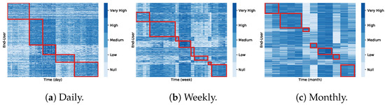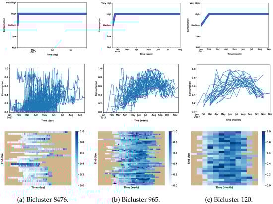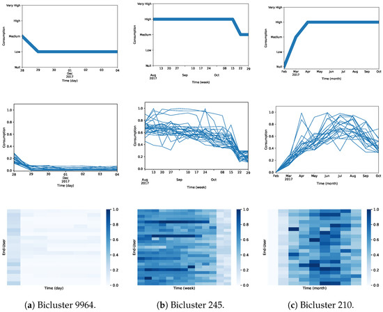 In the literature, a considerable number of clustering approaches have been proposed for the analysis of water consumption time series. Laspidou et al. [6] applied clustering on water-billing data to distinguish household from business end-use consumers; Cheifetz et al. [7] proposed an enhanced clustering methodology to discover consumption profiles from time series data; Ioannou et al. [8] also presented a technique to detect behavioral patterns in water consumption, grouping users by behavioral similarities; Candelieri et al. [9] used clustering as a substep to improve the accuracy of water demand forecasting; and Yang et al. [10] applied clustering as a sub-routine for categorizing end-use events. Considering water time series consumption data, clustering can (1) group end-users that present similar consumption behavior across the whole time dimension; (2) segment time series according to consumption patterns for all end-users. Clustering techniques, although typically used to explore water consumption data, fail to fully extract hidden patterns. It is known that in real-world scenarios, the correlation of a subset of objects is frequently only significant and meaningful for a subset of the overall conditions, and vice versa [11]. Factors such as days of the week, holidays, and seasons can cause users to change or drift consumption profiles over time. This means that clustering, by simply grouping end-users across the whole time dimension, is unable to identify users that have coherent consumption profiles during a specific time period (e.g., similar consumption profiles during the Winter but distinct profiles during the Summer). Moreover, clustering techniques are usually sensitive to noise, shifts, and scaling of the data, thus being unable to discover (without data transformations) non-constant, yet potentially relevant, consumption patterns, i.e., end-users with non-trivial but coherent consumption profiles caused by shifts or scaling factors within the consumption values.