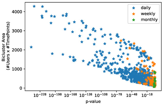 As introduced in Definition 7, the level of tolerated noise and missingness can be established. The allowance naturally impacts the size and amount of the recovered biclusters. The looser the allowance (high ), the larger the discovered consumption patterns, and the stricter the allowance (low ), the smaller the retrieved patterns.