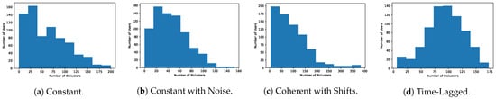 The placed homogeneity criteria determines the structure, coherence and quality of a biclustering solution [30]. The structure is described by the number, size, shape, and position of biclusters. Flexible structures of biclusters are characterized by an arbitrary number of (possibly overlapping) biclusters. The coherence of a bicluster is defined by the observed correlation of values (coherence assumption) and the allowed deviation from expectations (coherence strength). Commonly pursued forms of coherence are constant values across the subspace, rows, or columns. When considering numerical and ordinal data forms, biclusters can further accommodate additive and multiplicative factors (coherent values) or order-preserving factors (coherent evolutions). Figure 3 illustrates these different types of biclusters. Finally, the quality of a bicluster is defined by the type and amount of tolerated noise. Noise accommodation is important to handle the inherent variability of preferences assigned to identical items by a given user. Moreover, biclustering has also been addressed for dealing with time series data [18,31,32,33,34,35,36,37,38]. When compared to time series clustering, time series biclustering are able to find groups of similar objects that are similar during a partial sequence of time points, instead of the whole time span. Temporal misalignment between observations can be further accommodated in time series biclustering [39,40].