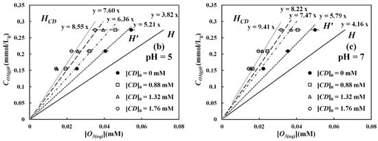 ) (0.88 mM, 1.36 mM, and 1.76 mM) at pH 3, 5, and 7. The solid lines in the figure represent the theoretical equilibrium relationship, estimated from the dimensionless Henry’s constant (H) [