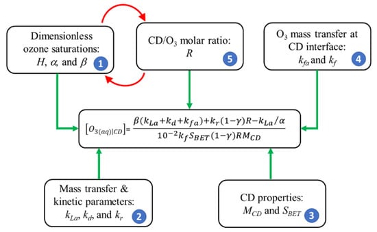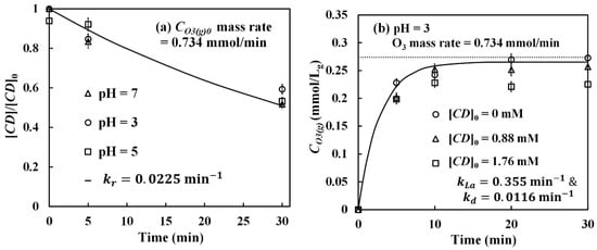 Figure 2a, it is seen that about 50% of β-CD was degraded by ozone (0.734 mmol/min) after 30 min, regardless of pH. According to differential equations of gas–liquid mass transfer with chemical reactions, we can solve for these fundamental equations and subsequently optimize pertinent mass transfer and kinetic parameters in the system. These parameters are shown in