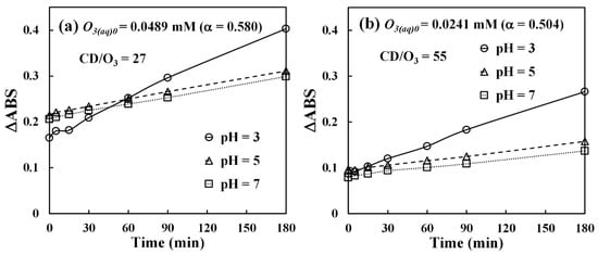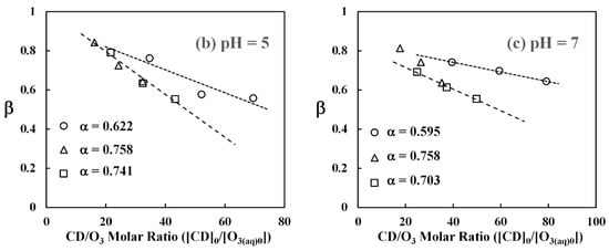 Figure 1b,c for the data of pH 5 and pH 7. The main reason for these phenomena is that at these pH values, what we have measured using the indigo method is actually the total oxidant concentrations, including both ozone and hydroxyl radical, but not just ozone alone as in pH 3. Although hydroxyl radical is a stronger oxidant than molecular ozone, it is short-lived, unstable, and cannot be included in the cavity of β-CD.