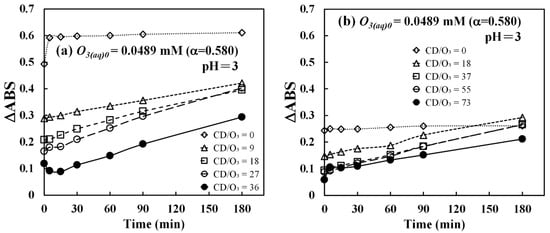 Figure 3b,c, meaning dissolved ozone concentration becomes higher under the same β-CD to ozone molar ratio. This is mainly due to a higher β-CD degradation so that less ozone is taken by β-CD.