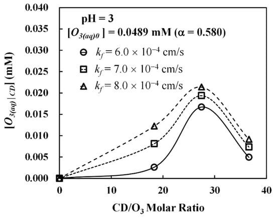 under a high β-CD concentration, ozone transferred to the β-CD interface is still limited due to low dissolved ozone concentration in the bulk solution. On the other hand, when the β-CD concentration is very low, the available dissolved ozone concentration becomes high in the solution since ozone is not consumed significantly. However, this causes the ozone gas–water mass transfer to become less efficient due to a smaller gradient across the gas–water interface as well as a smaller