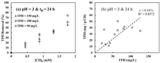 30) as the representative molar mass, and 50 mg/L of TPH would be equivalent to 0.252 mM. Thus, the aforesaid 30% of removal efficiency increase is the removal of 0.0756 mM of TPH (i.e., 0.252 mM × 30% = 0.0756 mM). Thus, the molar ratio between ozone and TPH is 0.09907:0.0756, which is roughly 1.3:1, a reasonable stoichiometry during the chemical degradation of TPH by released ozone. Finally, it should be noted that adding β-CD to the treatment process for a short reaction time (e.g., t