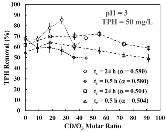 Figure 10, when α = 0.580, the removal efficiency essentially decreases as the molar ratio increases. This is because under the circumstances residual ozone is responsible for the degradation of TPH. More residual ozone is present in the solution when the molar ratio CD/O