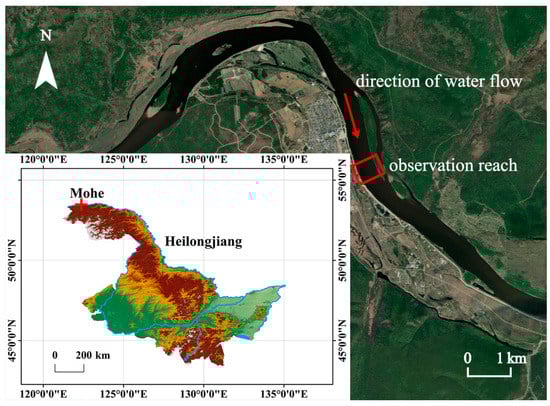 The Heilongjiang River is located in the northernmost part of China, with a wide drainage area and abundant water resources. The drainage basin is located in the cold temperate zone. The ice thickness can reach 2 m in winter, and the ice surface is covered with snow exhibiting an average thickness of 30 cm []. Due to the unique geographical location of Heilongjiang, the upper reaches of the Heilongjiang River flow from low latitudes to high latitudes [] through mountainous areas with narrow and tortuous river courses. There is abundant rainfall and runoff but insufficient observation equipment and measurement means. During the ice flood period, ice mainly accumulates in the Mohe section to form ice dams []. Therefore, the research area is the Mohe section in Heilongjiang Province, and the takeoff and landing point of the UAV is an open area southeast of the Mohe hydrological station (as shown in Figure 1).