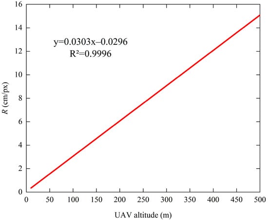 To realize quantitative analysis of the ice velocity, first, the UAV is deployed to shoot A1-sized paper panels at different heights to determine the shooting height of UAV remote sensing images and the actual area represented by a unit pixel. After the actual area is squared, a fitting equation between the unit pixel length and actual length in remote sensing images at the different heights is obtained, as shown in Figure 2.