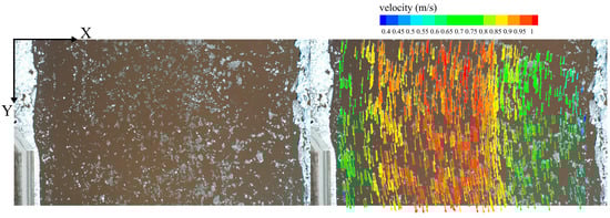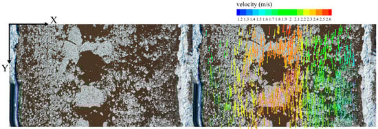 Through feature point selection, matching, and filtration of the two obtained orthophoto images, 1429 pairs of effective feature points (as shown in Figure 3) were extracted from the river section at 16:00 on 25 April 2021, and 2726 pairs of effective feature points (as shown in Figure 4) were extracted from the river section at 8:00 on 26 April 2021. According to the principle of feature point selection, there were sparse or even absent feature extreme points on the river surface, but the distribution of the feature points on the ice surface was relatively dense and stable, which satisfied the basic requirements of ice velocity analysis. At 8:00 on 26 April 2021, due to the large amount of broken ice in the river section, the selected effective feature point density was higher than that at 16:00 on 25 April 2021.