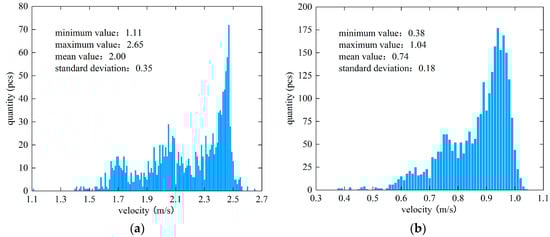 Statistical histogram of ice plane velocity (a) 16:00, 25 April 2021; (b) 8:00, 26 April 2021.