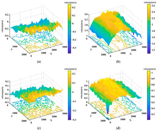 Distribution law of ice velocity components: (a) the transverse components of the ice velocity at 16:00 on 25 April 2021; (b) the longitudinal components of the ice velocity at 16:00 on 25 April 2021; (c) the transverse components of the ice velocity at 8:00 on 26 April 2021; (d) the longitudinal components of the ice velocity at 8:00 on 26 April 2021.