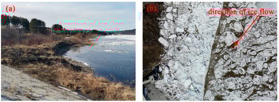 To study the distribution characteristics of the ice velocity during the ice flood period in the Mohe section of Heilongjiang more comprehensively, the transverse and longitudinal components of the ice velocity during the different periods were calculated by tracking the displacement components of the effective characteristic points in the corresponding coordinate system. For this calculation, Vx is the transverse component of ice velocity, Vy is the longitudinal component of ice velocity, and the positive and negative symbols indicate the direction of the velocity component. According to the schematic diagram of the observation geographical location, the observation area is located at a river bend. As indicated by the transverse velocity component shown in Figure 9a,c, the ice velocity upstream of the river was biased to the right side of the river, which can easily damage the right bank of the river, form ice accumulation, seriously block the water crossing section, and threaten the lives and property of people. For example, the ice accumulation and damage to the bank slope are shown in Figure 10, which are in line with the actual site conditions. As indicated by the longitudinal velocity component depicted in Figure 9b,d, the ice velocity was oriented along the river channel, and there occurred no ice reflux phenomenon affected by vortexing.