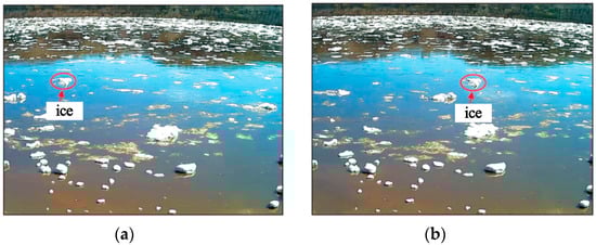 Manual extraction of ice position: (a) original position of target ice at 10:28 on 2 May 2016; (b) position of target ice after 10 s [].