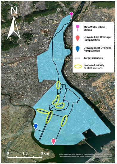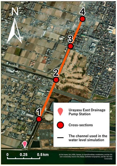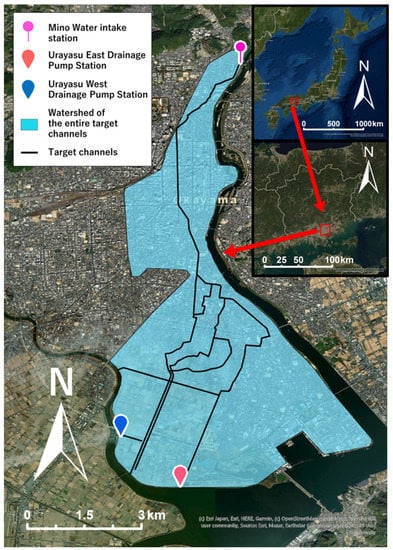 Figure 1 shows the location of Okayama city, the channels targeted in this study and the watershed comprising all target channels. These channels mainly include the main channels in Okayama city that flow from the water intake station at Mino to the Urayasu East and Urayasu West Drainage Pump Stations. Because these main channels do not flow directly into the Urayasu West Drainage Pump Station, the nonmain channel that flows in front of the pump station was selected for analysis in this study.