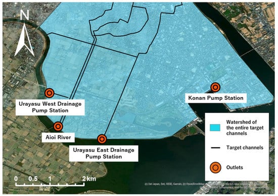 The watershed comprising all target channels was first determined based on the topography data and the watersheds of the surrounding rivers. Then, the watershed area containing all target channels was assigned based on the widths of the four outlets, including the Urayasu East and Urayasu West Drainage Pump Station channels. Figure 2 shows the outlet locations. Table 1 shows the channel width at each outlet, and Table 2 shows the areas of the watersheds corresponding to the target channels and the channels of each drainage pump station.
