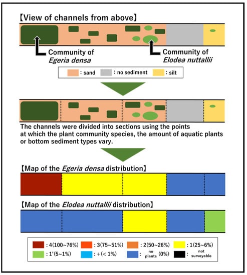 The method used to conduct the aquatic plant distribution survey is shown in Figure 5. First, the channels were divided into sections using the points at which the plant community species, number of aquatic plants, or bottom sediment types varied. Then, the vegetation coverage was surveyed within each of these separate sections. The coverage is the area of the aboveground portion of a grass species relative to the ground surface; this value is expressed as a percentage []. In this distribution survey, coverage was considered to represent the area of aquatic vegetation covering each channel. The coverage of each aquatic plant species growing in each section was visually calculated and recorded through degree classification according to Penfound’s method []. In this method, the vegetation coverage was classified into 6 categories: 4 for 100–76%, 3 for 75–51%, 2 for 50–26%, 1 for 25–6%, 1’ for 5–1%, and + for less than 1%. In this study, a grade of “0” was added to represent areas in which no aquatic plants were found, and areas that could not be surveyed were designated “not surveyable”. The survey results were visualized using maps constructed by GIS software.