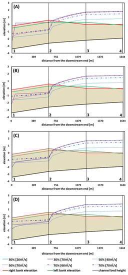 Water level simulation results obtained for the Urayasu East Drainage Pump Station channel ((A) no backwater, (B) backwater height of 0.2 m, (C) backwater height of 0.4 m, (D) backwater height of 0.6 m). In the legend, % and [] mean initial water depths and discharges, respectively.