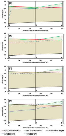 Figure 7 and Table 6 show the results obtained for the Urayasu West Drainage Pump Station channel. In this channel, when the initial water depths were set to 30% and 50% of the channel depth, the location of inland flooding did not change regardless of whether backwater occurred, except in the case of the 30% initial depth and 40 m3/s discharge. However, when the backwater height was 0.2 m, inland flooding occurred on the right bank of cross-section 3, and when the backwater height was 0.4 m, the water level was the same as that of the right bank of cross-section 2, and inland flooding occurred on the right bank of cross-section 3. When the backwater height was 0.6 m, inland flooding occurred on the right bank of cross-section 2 and on the right bank of cross-section 3, and the water level was the same height as the left bank of cross-section 2.