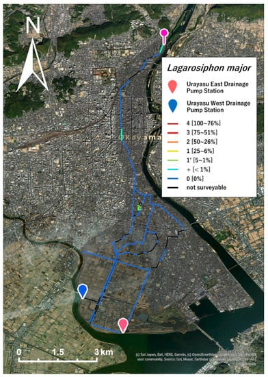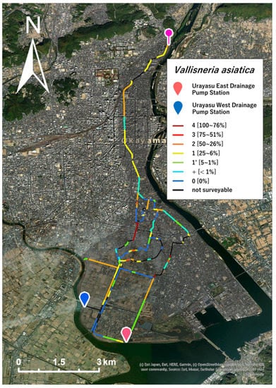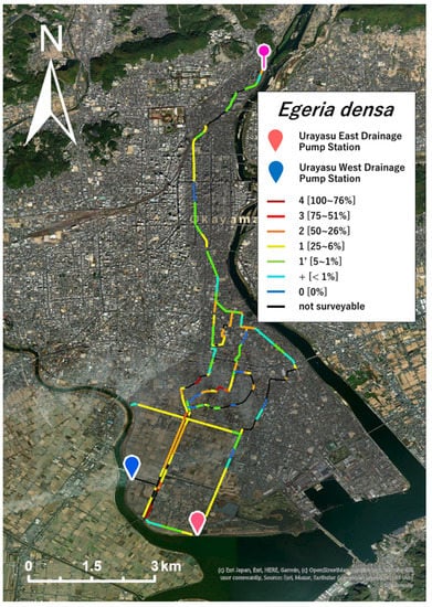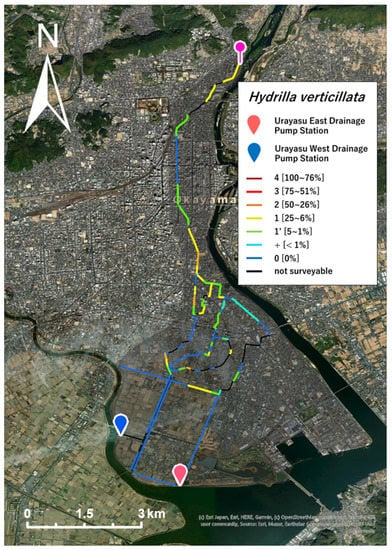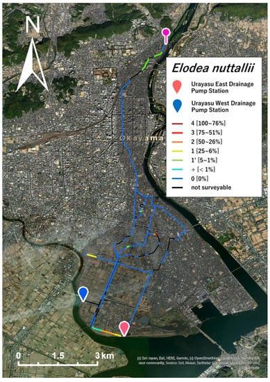 Another factor that increases the risk of inland flooding in Okayama city is the problem of aquatic plant growth. In recent years, a large number of aquatic plants have grown densely in local channels, blocking the flow of water []. During heavy rains, aquatic plant fragments clog the fine-particle screens in the Urayasu area located in the southern part of Okayama city, obstructing the flow of water draining through the screens. Due to these clogging fragments of aquatic plants, the water level of the channels rises at the screens, and backwater develops, leading to inland flooding in the areas surrounding the screens. In this way, aquatic plants are closely related to inland flooding. Because some species of aquatic plants easily accumulate in fine-particle screens in Okayama city while other species rarely accumulate in the screens, we believe that the total volume of clogging plants could be efficiently reduced by strategically controlling the easily accumulating species. The main plants that accumulate in fine-particle screens consist of five species: Egeria densa, Elodea nuttallii, Hydrilla verticillata, Lagarosiphon major, and Vallisneria asiatica. Therefore, these five species should be specifically controlled.