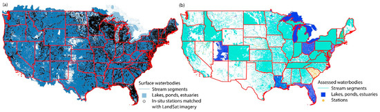 Assessment and in-situ monitoring gap for water quality in the United States: (a) 39.6 million stream segments, ponds, lakes and estuaries in the National Hydrography Dataset and 603,433 in-situ monitoring locations from the AquaSat database for Secchi disk depth, Chlorophyll-a, total suspended solids and dissolved organic carbon that have been matched to landSat scenes, and (b) the 430,893 assessed waterbodies in the United States obtained from the United states Environmental Protection Agency’s Assessment and Total Maximum Daily Load Tracking and Implementation System (ATTAINS) database. Red lines indicate state borders.