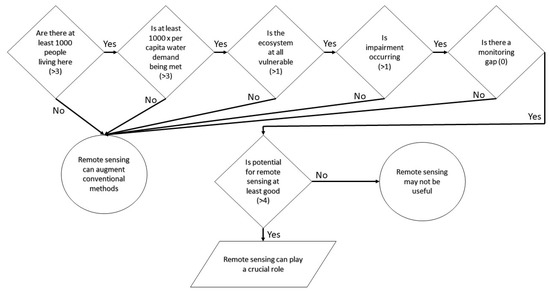 Finally, we also produced a remote sensing monitoring potential map using the normal cost-payoff estimates from Table 2 to indicate where remote sensing would be likely feasible. Subwatersheds where the role of remote sensing is likely to be most crucial were then classified as those that met the decision tree in Figure 3, that is, where all the layers after suitable thresholding to represent various risks intersect with at least good potential for remote sensing.