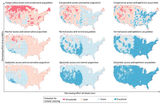 Modeled maps of the potential of remote sensing for data collection and monitoring of watersheds under various cost-payoff assumptions. As the effect of cloud cover decreases (more cloudy days are acceptable), more cloudy areas display higher potential. As the effect of access decreases (longer travel times are acceptable), more remote areas display higher potential. Thin red lines are state boundaries.
