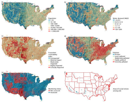 We modeled the potential for remote sensing using Equation (1) and surrogates for accessibility and acquisition. However, these maps in themselves provide only one piece of the puzzle. It is only when the potential for watershed monitoring using remote sensing is combined with risk maps and lack of coverage by conventional monitoring that areas can be identified where remote sensing can play a crucial role. To do this, we developed maps of five metrics of risk using published GIS data from the EnviroAtlas [32] (Table 1): (i) the human footprint, (ii) anthropogenic water demand, (iii) ecosystem vulnerability, (iv) impairment, and (v) conventional monitoring and assessment coverage gaps. As the units of these metrics are different from one another, we simply overlaid these maps and determined the intersecting areas to determine where the remote sensing role would be most useful.