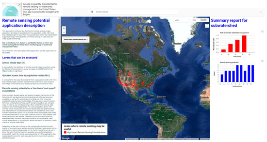 We have presented a set of maps that chart the potential of remote sensing to augment the monitoring and data collection in watersheds for land surface and water quality processes. These are available for open source download in a Git repo [35]. To enable easy access to, and visualization of these maps, the risk factors for impairment, and summary statistics of the potential of remote sensing under various assumptions within the cost-payoff matrix, we have also developed an app [36] using Google Earth Engine [37]. This app contains an interactive map within which the user can click on a specific subwatershed of interest to obtain additional information (Figure 6). A summarization of this paper is available as a guide to using the app in a separate panel. Once a subwatershed has been clicked, a summary visual report will be generated, and the relevant information on the impairment risk factors and the potential for remote sensing can be downloaded as comma-separated value files.