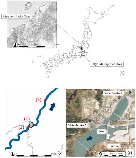Miyanaka Intake Dam (37°3′58.445″ N, 138°41′50.321″ E) was built in 1939, and the fishway installed since the time of construction was improved once in 1986. Two sizes of stair-type fishways—the first measuring 218 m long and 10 m wide and the second 262 m long and 2 m wide, folded 110 m from the upstream entrance—were installed to compensate for an altitude difference of 6 m between the upstream and downstream water levels across the dam. However, they were insufficient for fish migration in the river and thus reconfigured in 2012 to target a wider range of species [52]. Figure 1a–c shows the location of Miyanaka Intake Dam, the survey points utilized in this study, and the fishway.