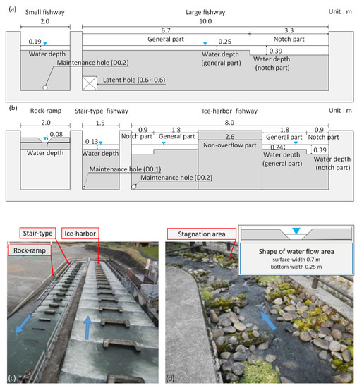 Fishway specifications. Three fishways with different water depths and flow velocities were constructed at Miyanaka Intake Dam. The width details are shown in Figure 2c,d.