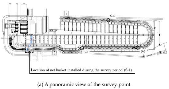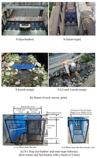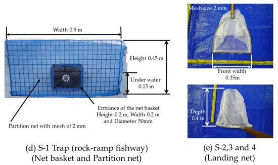 In the fishways, only trap-based surveys were conducted at the upstream end. Figure 3 shows the fishway monitoring status. The traps were installed during the survey period at the upstream ends of all fishways. To cover the entire widths of the fishways, six traps were installed on the ice-harbor fishway, two traps were installed on the stair-type fishway, and one trap was installed on the rock-ramp fishway. The trap consisted of an iron frame and a net basket. On the downstream side (entrance for fish) of the net basket, a guide part that narrows toward the upstream (entrance of the net basket) was provided. After passing through the induction part, the fish entered the net basket from the entrance of the net basket. At the S-1 point of the rock-ramp fishway, a net basket was installed in the main flow to capture all fish. Therefore, a partition net was installed so that the fish could migrate only in the main flow. The fish were then collected in the opening of the net basket. During the survey period, the basket was manually retrieved every hour from the water to prevent the fish from filling up the net basket and clogging the mesh of the net basket with dust, and all the fish in the basket were caught. A survey to count the species and individuals of fish was conducted from 6 June to 4 July, 2012, 2014, and 2015, and from 6 June to 10 July 2013 [75]. Prior to this survey, a 24 h survey including nighttime was conducted for two days, from 8 to 9 June 2010. However, most fish were not caught at night. Thus, the survey from 2012 was conducted from 7:00 to 19:00. For all trapped fish, photographs were captured, and the body lengths and weights were measured before the fish were released back into the river.