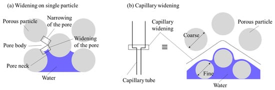 Figure 1. Two types of “interruption on widening void space” under microgravity: (a) the interruption on the widening on the single porous particle [9] and (b) the interruption on the widening of capillary (Maruo et al. [10] for capillary tubes; Or et al. [11] for porous media).