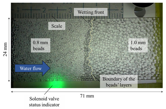 Figure 2. Two layers of the glass beads’ porous media were packed into the 2.4 mm thickness Hele-Shaw cells. The boundary of the 0.8 mm and 1.0 mm beads’ layers was the widening of the capillary model. The green LED indicated the status of the solenoid valve.