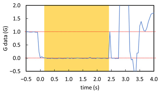 Figure 3. Typical gravity observed from the free fall from the drop tower. The shaded area represents the analyzed period in which the solenoid valve was opened to let water infiltrate into the glass beads.