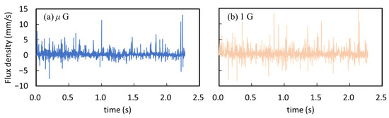 Under microgravity and under 1 G, the wetting front went over the widening of single porous particle. Figure 5 shows water flux densities at every 0.001 s in porous media under microgravity and 1 G. The maximum microscopic flux densities of capillary-driven flows were about 30-times larger than the macroscopic mean flux densities, which is smaller than the pressurized drainage process that is more than 50-times larger [13,14]. Figure 6 shows the relative frequency distribution of the water flux densities in porous media under microgravity and under 1 G. The variances under microgravity and under 1 G were 1.54 and 2.14, respectively, which were slightly larger under 1 G than under microgravity (Figure 6: normal distribution). However, no significant gravity dependency was observed (p = 0.56).
