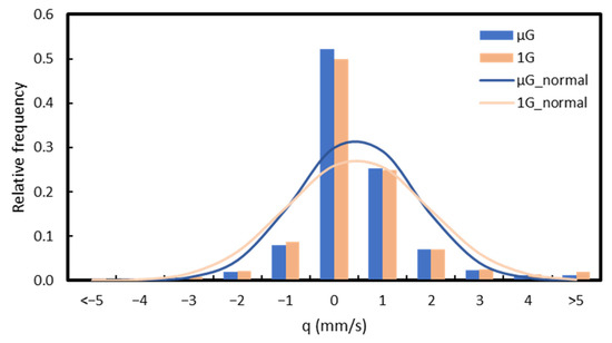 Figure 6. The relative frequency distribution of the water flux densities in porous media under microgravity and 1 G. The bar and lined graph indicated the measured and normal frequency distribution, respectively.