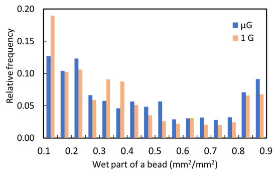 Figure 7. The relative frequency distribution of the wet part on each bead at every 0.001 s. The higher frequency implies the wetting front stopped there longer. Bimodal distributions were observed both under microgravity and under 1 G.