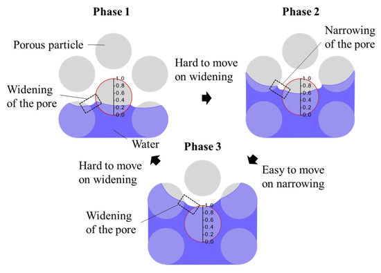 Figure 8. Diagram of the wetting process observed in this study. The scales indicate the wet part of the central beads. A high relative frequency of the wet part was observed in phases 1 and 3, which indicates that the wetting front had difficulties passing over the widening parts.
