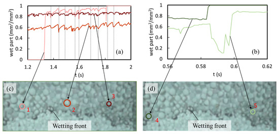 Figure 9. The time series and the percentage of the wet part of each bead. (a,c) indicated that the oscillations of the wetting front synchronized with each other. The dashed line expresses the time when backward infiltration was observed. (b,d) indicated that the wetting front on bead number 5 went backward when the wetting front on bead number 4 went forward. The wetting front on bead number 5 infiltrated forward more after the front moved backward, which suggested that inertia forces played an important role in the wetting process.