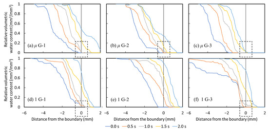 Figure 10. Relative volumetric water content observed under (ac) microgravity and under (df) 1 G. The wetting front passed over the boundary both under microgravity and under 1 G.