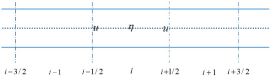 Here, we use a set of 1D cells to obtain a graphical description of the river. An unstructured staggered grid with a variable arrangement is used to discretize the equation (see Figure 1). The cross-section topology data is arranged at the center of the control volume. The control volume has at least two interfaces (see dotted line in Figure 1). The velocity u is defined at the interface centers, and the water level is defined at the cell centers. The biggest advantage is that, compared with a collocated grid, a staggered grid can maximize the use of measured terrain data without reconstructing the interface for interpolation. The control volumes are sequentially donated by i, i + 1,..., N.