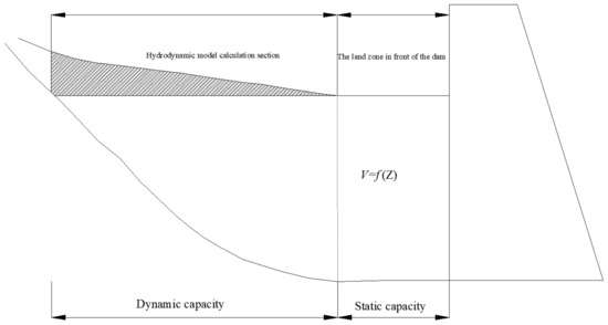 The water surface of river type reservoirs in mountainous areas will form a certain gradient, so the actual water surface is not horizontal, as shown in Figure 2 [30], which leads to the existence of dynamic storage capacity in the reservoir. The water surface in the reservoir area is divided into the land zone in front of dam and a warped section. The accuracy of the calculation results can be guaranteed when using a static storage capacity curve to calculate the storage capacity of the land zone in front of dam section, but the storage capacity will be smaller when calculating the warped section.