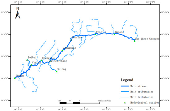 The Three Gorges Reservoir area, which is located downstream of the Jinsha River was selected as the study area, stretching from Zhutuo to the Three Gorges Dam. The length of the study area is about 760 km. The width of the Jinsha River is between 700 and 1700 m. The Three Gorges Reservoir area is located at the alternation of the second and third levels of topography in China. The geographical conditions are very complex in the Three Gorges Reservoir area, which is surrounded by the Qiling and Daba Mountains in the north and Wu Mountain in the south, and the area comprises 74% mountains, 21.7% hills and 4.3% plains [31]. It is a typical river-type reservoir, and therefore, the Three Gorges Reservoir has great dynamic capacity. The Three Gorges Reservoir area begins at the hydrological station in Zhutuo, as Figure 4 shows, and along the river, there are many hydrological stations, including Cuntan, Qingxichang, Wanxian and Fenghuangshan. The Fenghuangshan hydrological station is close to the dam, so we can use the data from this station on behalf of the water level in front of the dam. There are many small rivers in the reservoir area, such as Quxi River and Modao River, among others. The reservoir area has a subtropical monsoon climate, and the large amount of precipitation in the flood season will lead to interval runoff that cannot be ignored for the whole interval. Relevant studies show that the average contribution of interval inflow to the flood peak in the reservoir area is 20%, and the maximum is close to 50% [32]. The total storage capacity of the Three Gorges Reservoir is 39.3 billion m3, and the flood control storage capacity is 22.15 billion m3. The Three Gorges hydropower station is the largest hydropower station in the world, with a total installed capacity of 22.5 million kW that is produced by thirty-two 700,000 kW generating units and two 50,000 kW auxiliary power units. The normal water level of the Three Gorges Reservoir is 175 m, and the flood limited water level is 145 m.